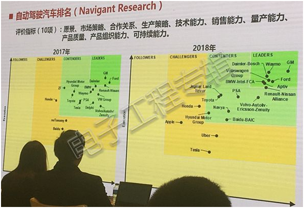 從技術(shù)成熟度上來看,頭部企業(yè)進展迅猛,但由此帶來的兩極分化也很明顯,除了那些我們熟悉的大廠,其他都在做分母。產(chǎn)業(yè)化能力上,傳統(tǒng)車企占據(jù)優(yōu)勢,在成波教授曬出的一張圖上,我們看到美國研究咨詢公司Navigant Research對2018年自動駕駛企業(yè)做的一個排名,通用汽車、福特、大眾、寶馬、戴姆勒等傳統(tǒng)車企處于第一梯隊,而Waymo、Aptiv這些技術(shù)性新興企業(yè)也表現(xiàn)搶眼。