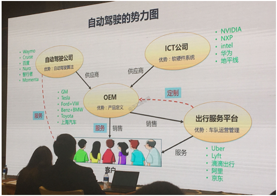主機廠處于弱勢,又沒有自動駕駛需要相關的團隊、技術(shù)、市場,怎么辦?組織生態(tài)聯(lián)盟自救,逐漸就形成了上圖的一個勢力圖。一個是原來占龍頭地位的主機廠OEM;一個是做自動駕駛方案的,以Waymo、Cruise、百度、Momenta這些初創(chuàng)公司為代表的;再來是英偉達、英特爾、華為、地平線這些做ICT,以及博世這類做芯片、操作系統(tǒng)、平臺、架構(gòu)的公司,主導軟硬件系統(tǒng);還有一個新勢力就是出行平臺,像Uber、滴滴,物流方面阿里和京東也進入了。
