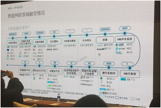 下圖是基于2017年的數(shù)據(jù),我們可以看到,像軟件算法、車載傳感器、屏幕都是投資熱點,大家可以在里面得到一些啟示。